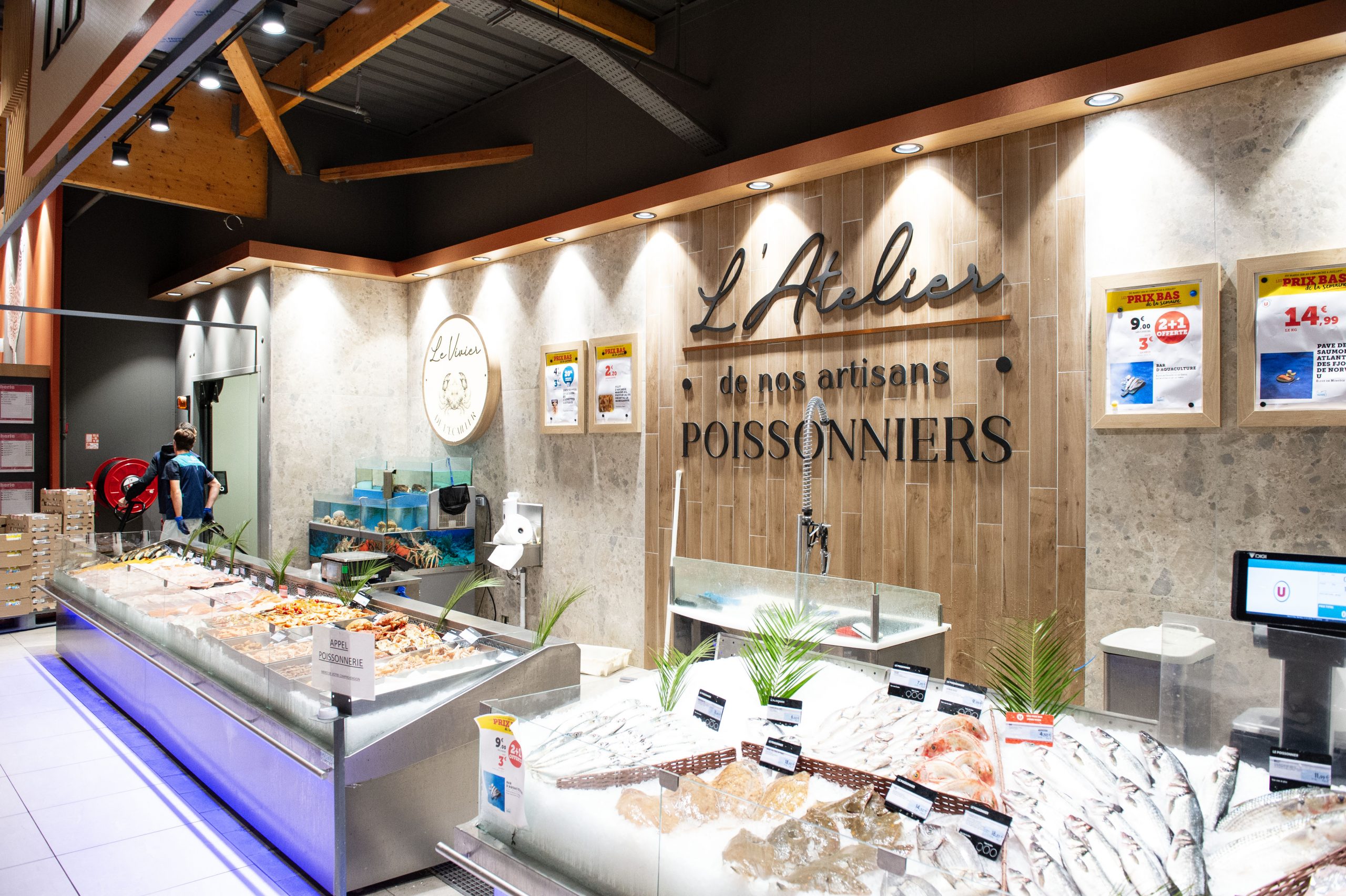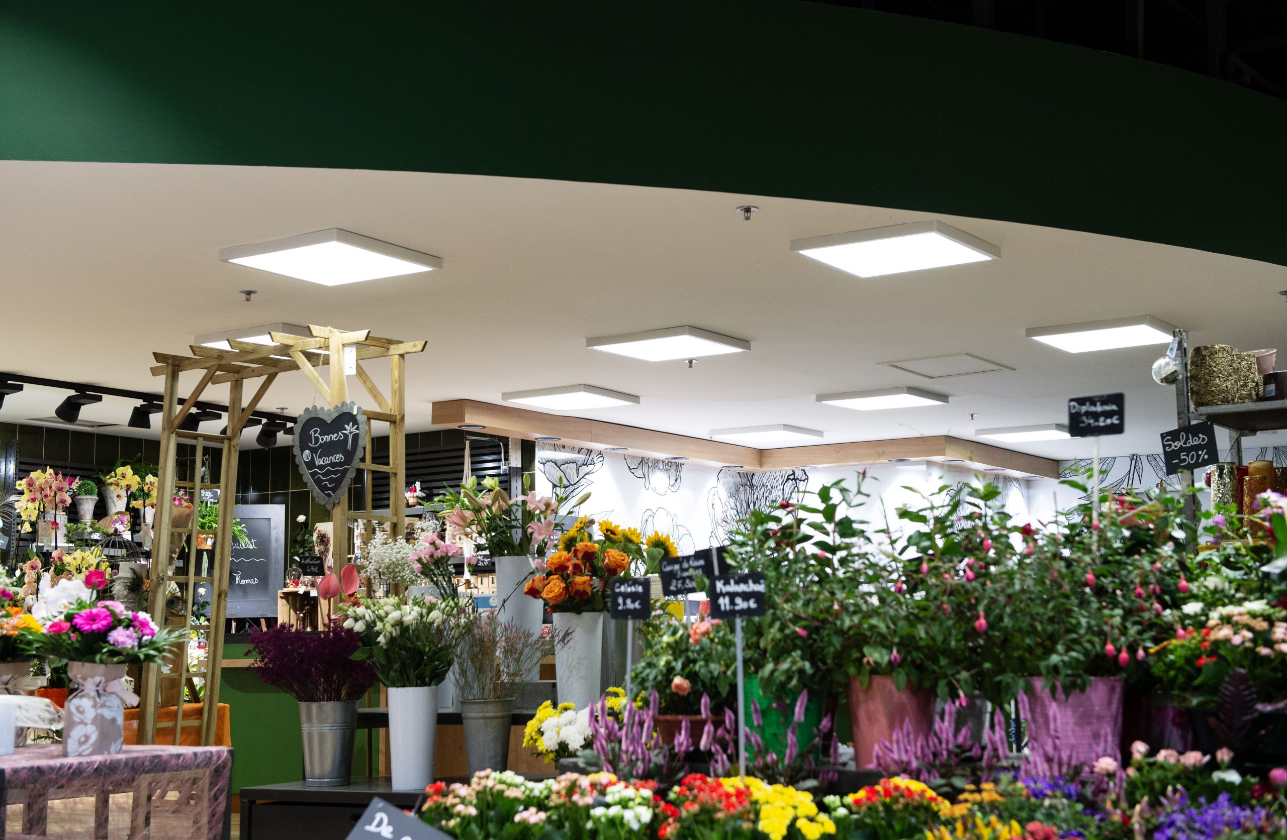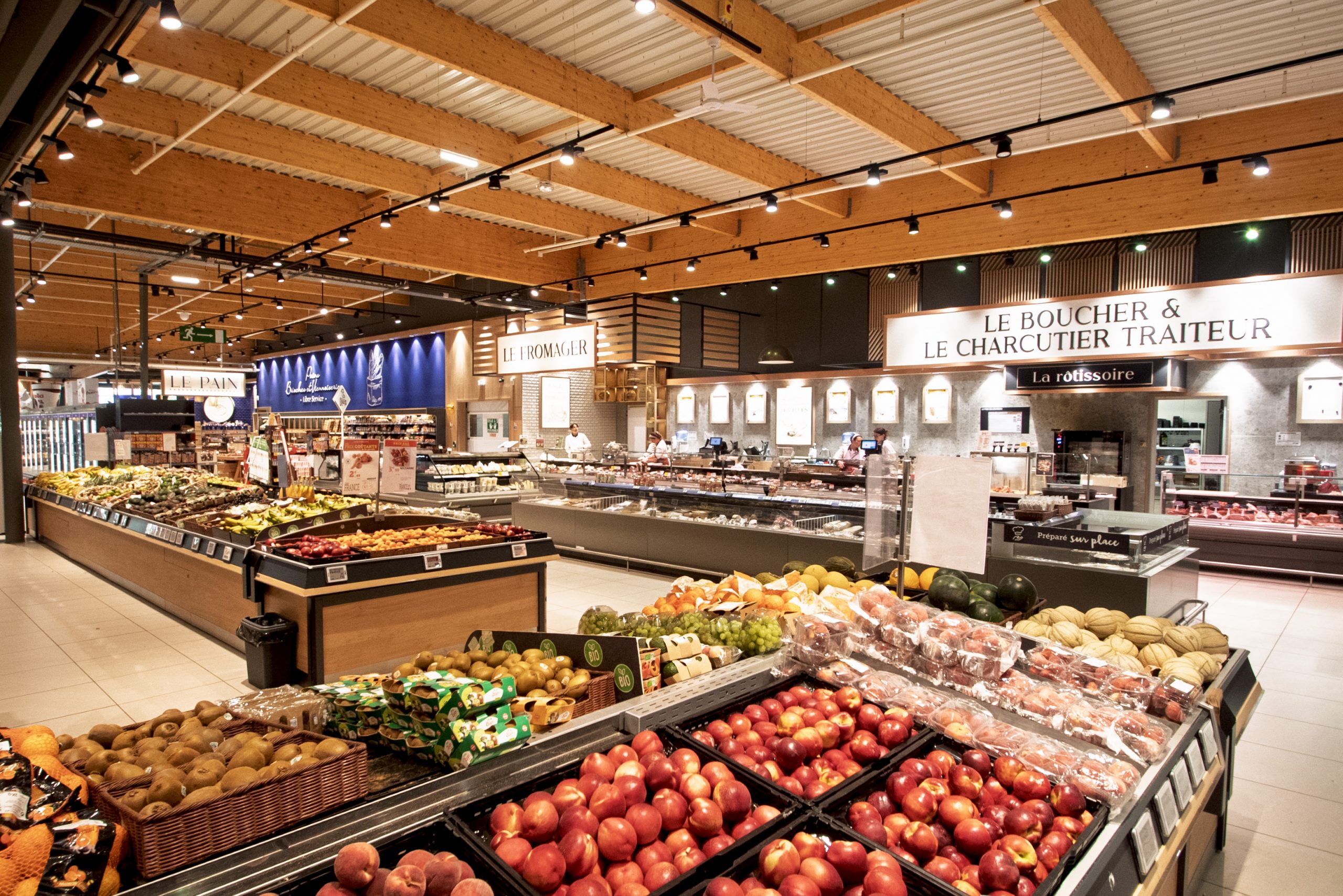 Dans le cadre de cette transformation, nos équipes ont assuré la mise à niveau électrique du site et sa transition énergétique. L’ensemble du magasin a été équipé d’un éclairage LED performant, garantissant une lumière plus homogène, plus économe et plus valorisante pour les espaces de vente. Les zones métiers — boulangerie, boucherie, poissonnerie, fruits et légumes — bénéficient d’un éclairage dédié sur rails et projecteurs afin de mettre en avant les produits et le savoir‑faire présent en magasin.